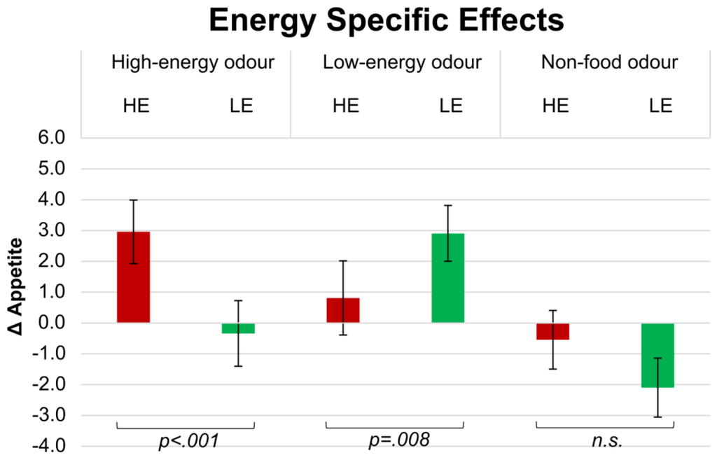 Paired comparisons showed that after smelling HE odours, Δ appetite for HE products (2.3 ± 1.1) was significantly different from Δ appetite for LE products (−0.7 ± 1.1; p < 0.001).
