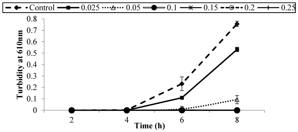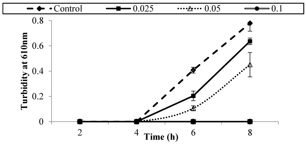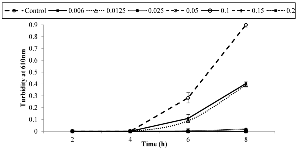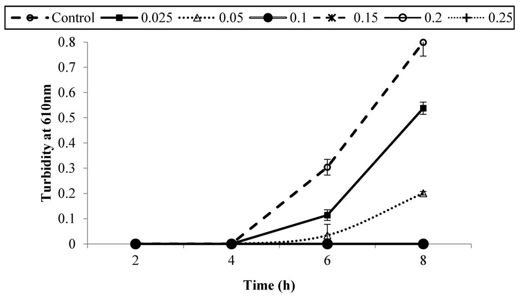 Bacterial growth was monitored by measuring turbidity at two-hour time intervals during incubation at 37 °C over 8 h using a GENESYS™ 10S UV-Vis spectrophotometer (Thermo Electron Scientific Co., Madison, WI, USA) at a 610 nm wavelength.
