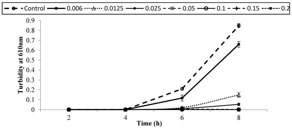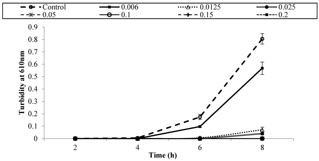 Figure 1, Figure 2, Figure 3, Figure 4, Figure 5 and Figure 6 show survival and growth of three strains of E. coli O157:H7 (ATCC700599, ATCC51659, and ATCC43895) in BHI medium with different concentrations of armoise and clove bud EOs during incubation at 37 °C for 8 h. In the control samples, the initial growth as determined by turbidity at 610 nm was ~0.0. The bacterial strains continued to grow during the incubation period and reached the stationary phase within 6–8 h. Turbidity readings reached ~0.80 after 8 h. With the addition of armoise EO at low concentrations (0.025% and 0.05%), turbidity readings were similar to the control samples, while high concentrations of armoise EO (≥0.1%) inhibited the growth of all tested strains as evidenced by low turbidity readings. Turbidity readings were ~0.50 with the addition of clove bud EO at low concentrations (0.006%), and ~0.0 at high concentrations (≥0.0125).