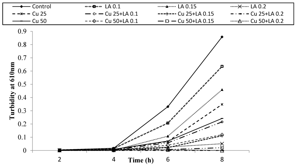 Figure 7, Figure 8 and Figure 9 show survival and growth of E. coli O157:H7 strains (ATCC 700599, ATCC 51659 and ATCC 43895) in the presence of Cu and LA at different concentrations during incubation at 37 °C for 8 h. The bacterial strains continued to grow during the incubation period and reached the stationary phase within 6–8 h. The turbidity readings reached an absorbance of ~0.82. When Cu was added to BHI broth at a concentration of 25 ppm, absorbance was ~0.34, and at a concentration of 50 ppm Cu, absorbance was ~0.21. The growth of bacterial strains was similar to the control with the addition of LA at concentrations of 0.1% and 0.15%. However, when a combination of Cu (25 and 50 ppm) and LA (0.1% and 0.15%) was used, the turbidity reading was 0.0.