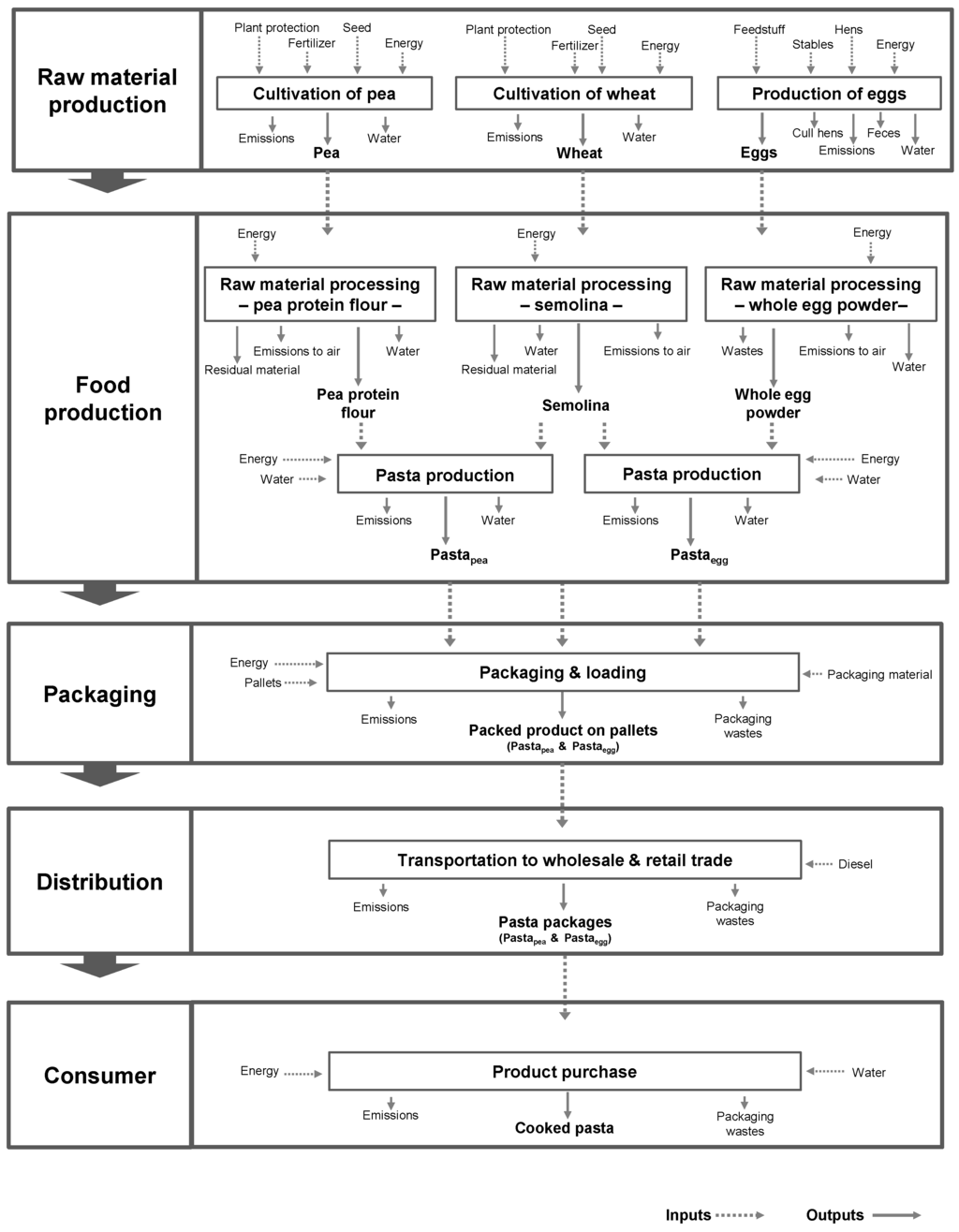 Input and output data for the main process step of “raw material production” were taken from available databases on agricultural production [20,21,22,23,24]. The production data of pea protein flour are given by the company “GEA Westfalia Seperator Group” [25] and available data from scientific literature [26,27]. Data on spray-dried whole egg powder and on the whole process of dry pasta production (pasta production, packaging, distribution and consumer) were gathered from available data from pasta producers and scientific literature [17,19,24,28,29].