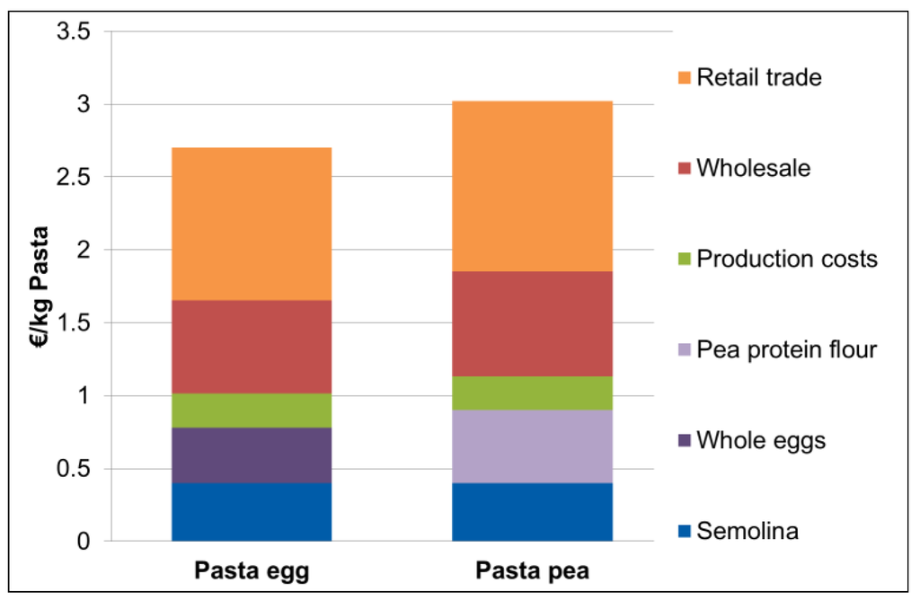 The production costs of the two pasta products differ a little (0.30 €/kg pasta), and this is mainly determined by the higher costs of pea protein flour extraction compared to the costs of egg pasteurization. This finding is in accordance with others [24,27]. In the case of pea protein flour, one possible reason for the higher protein price may be the limited demand of pea protein flour compared to whole egg. However, the protein concentration of the pasta based on whole egg is slightly lower (204 g/kg dry pasta) compared to the pasta based on pea flour (212 g/kg dry pasta). Taking this difference into account with a protein-corrected composition of the two pastas, however, only marginally affects the cost difference of the two pastas (0.29 €/kg pasta).