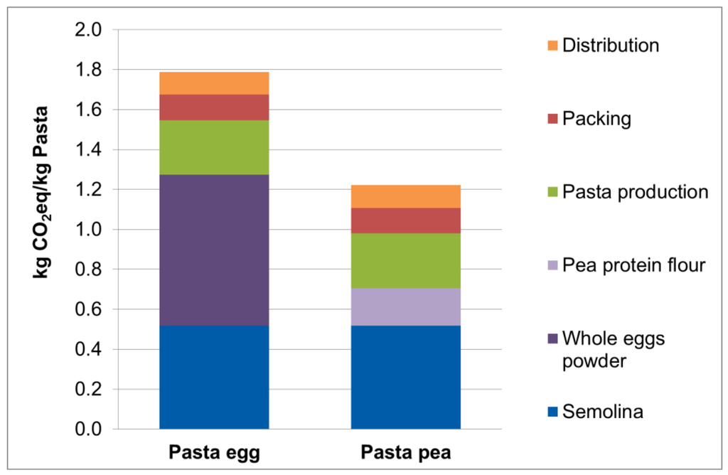 Feed and food production are inter alia reasons for high greenhouse gas emissions. Greenhouse gas emissions could be reduced by the replacement of animal components with plant components in processed food products, such as pasta. The main components currently used for pasta are semolina, and water, as well as additional egg. The hypothesis of this paper is that the substitution of whole egg with plant-based ingredients, for example from peas, in such a product might lead to reduced greenhouse gas emissions (GHG) and thus a reduced carbon footprint at economically reasonable costs. The costs and carbon footprints of two pasta types, produced with egg or pea protein, are calculated. Plant protein–based pasta products proved to cause 0.57 kg CO2 equivalents (CO2eq) (31%) per kg pasta less greenhouse gas emissions than animal-based pasta, while the cost of production increases by 10% to 3.00 €/kg pasta.