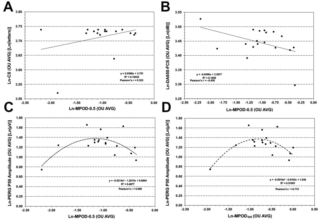 Since measurements between eyes were highly inter-correlated, all BL correlations were investigated using the inter-ocular averages for each measured variable. As illustrated in Figure 1A, Ln-MPOD-0.5 was positively correlated to Ln-CS (r = 0.323). This correlation was considerably lower for Ln-MPOD-2.0 (r= 0.040, not shown) and, thus, also the correlation with Ln-MPODtot was diminished (r = 0.233, not shown) when Ln-MPOD-2.0 was averaged in. Ln-MPOD-0.5 showed an inverse relationship with DA650-FCS (r = −0.430, Figure 1B, whereas Ln-MPOD-2.0 was unrelated to DA500-PFRS (not shown). Interestingly, Ln-MPOD-0.5 displayed a curvilinear, ∩-shaped relationship with Ln-PERG P50 amplitude, with PERG P50 amplitudes tending to be largest for intermediate, and not the highest, MPOD levels. This ∩-shaped, curvilinear relationship was robust for both Ln-MPOD-0.5 (r = 0.698, Figure 1C) and Ln-MPODtot (r = 0.715, Figure 1D).