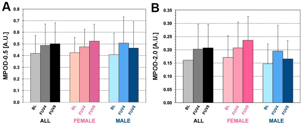 As illustrated in Figure 2A, MPOD-0.5 increased significantly at both FUV4 and FUV8 (BL: 0.40 ± 0.17; FUV4: 0.49 ± 0.19; FUV8: 0.50 ± 0.17, p-value for paired t-test << 0.00001 for both). Significant increases occurred in both genders (mean ∆% at FUV4: F: +16%, M: +23%), continued further at FUV8 in females (mean ∆% at FUV8: +20%), but plateaued in males (+21%). As shown in Figure 2B, MPOD-2.0 showed the same trend (0.16 ± 0.08 at BL; 0.20 ± 0.10 at FUV4, p = 0.0001; 0.21 ± 0.09 at FUV8, p = 0.00002). Significant increases occurred in both genders (mean ∆% at FUV4: F: +12%, M: +20%) and continued further at FUV8 in females (mean ∆% at FUV8, F = +27%, p << 0.00001), whereas this phenomenon was not observed in males, in whom the observed MPOD-2.0 increases seen at FUV4 regressed partially (mean ∆% at FUV8, M = +11%, p > 0.05). At FUV4, we observed three non-responders. Two of these participants were females, one was male. These participants exhibited MPOD response at FUV8 (∆% values of +25.58%, +21.83%, and +13.45%, respectively). At FUV8, three participants who were responders at FUV4 (∆% values of +12.50%, +18.18%, and +22.50%, respectively) no longer met these criteria (∆% values vs. BL of +6.51%, +6.90%, and +3.13%, respectively) and had regressed to MPOD values within the BL variability levels. All other participants exhibited a response to supplementation at both time points.