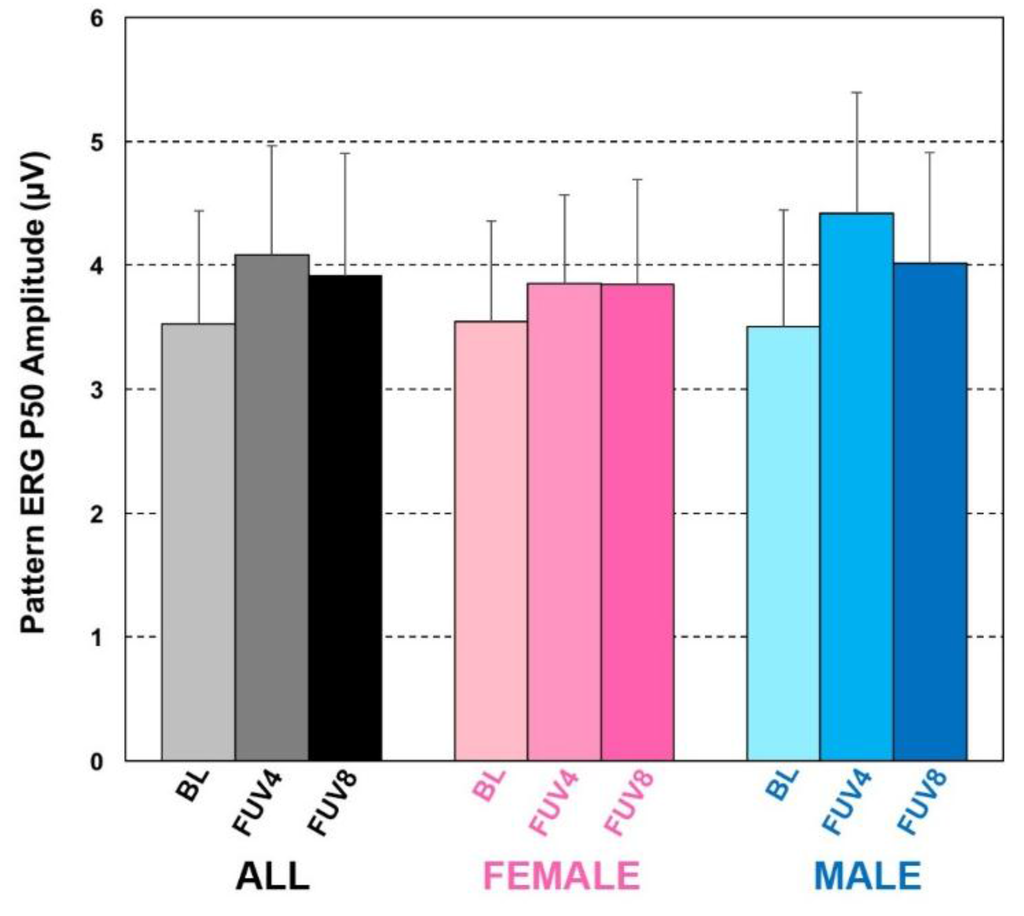 Compared to BL (3.53 ± 0.91 µV), the PERG P50 response increased significantly after supplementation for the whole study sample and in analyses stratified by gender. At FUV4, a 12% average PERG P50 increase was observed (4.08 ± 0.81 µV, p = 0.0002), followed only by a partial decline in this improvement after wash-out (FUV8: 3.92 ± 0.94 µV, +6.8% on average vs. BL, Figure 3). Although small, because of the high reproducibility of our measurements and the paired data t-test analysis strategy, this improvement remained significant vs. BL also at FUV8 (p = 0.01). Different than what we observed for the MPOD and CS behaviors, the improvement in macular function at FUV4 by PERG P50 criteria was more robust in the male subgroup (3.51 ± 0.98 µV at BL; 4.42 ± 0.84 µV at FUV4, p = 0.0014) than among females (3.54 ± 0.88 µV at BL; 3.85 ± 0.72 µV at FUV4, p = 0.0473). Consistent with the persistent MPOD increases seen at FUV8, also PERG P50 amplitude remained elevated vs. BL at FUV8 in both subgroups (F: 3.85 ± 0.98 µV; M: 4.02 ± 0.89 µV), although this difference was no longer statistically significant (p > 0.05 in both cases).
