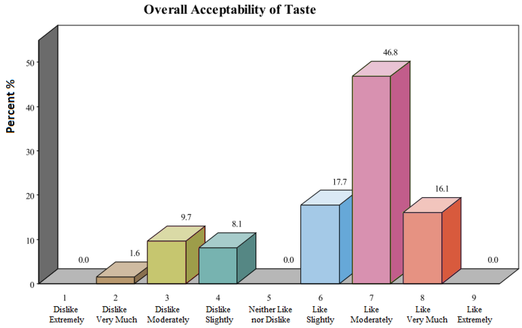Sensory evaluation results are presented in Figure 1. Nineteen percent (19%) disliked the product, defined as a score of <5.0 on a nine-point hedonic scale. Liking the bar was defined as a score of six or greater. Eighty-one percent (81%) rated the bar as acceptable. A Z test for distribution demonstrated a probable range of 70%–90% rating the bar as acceptable (95% Confidence Interval: 0.7076, 0.9044).