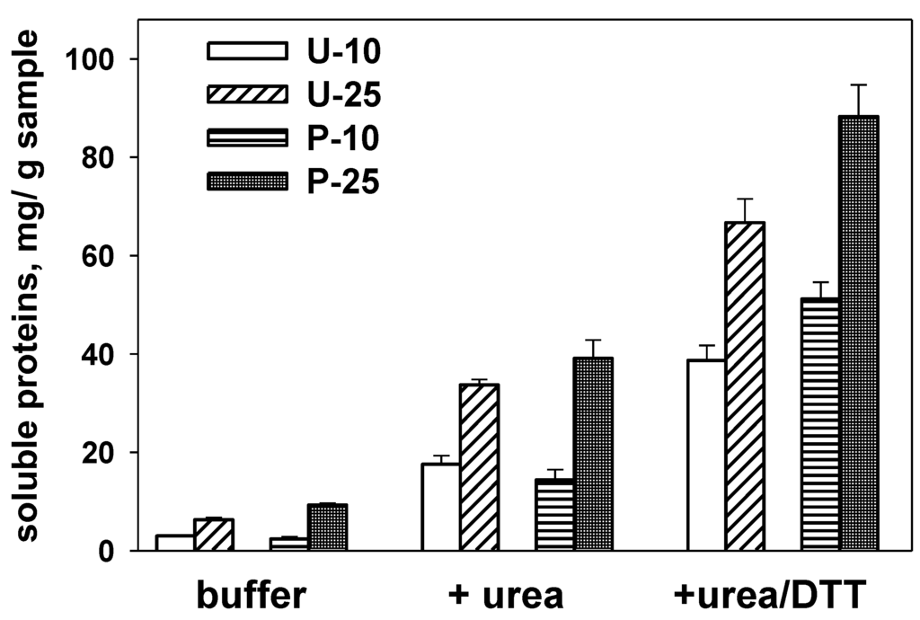 The amount of proteins solubilized from the various samples in different buffer systems. Aliquots of the various samples were suspended under stirring in 0.05 M sodium phosphate, 0.1 M NaCl, pH 7.0, in the presence/absence of 6 M urea and 10 mM DTT, as indicated. Different letters for results obtained with each buffer system indicate significant differences (p ≤ 0.05). Samples are identified by letters (indicating the use of untreated (U) or parboiled (P) rice) and digits (10, 25) indicating the percent content in soybean flour.