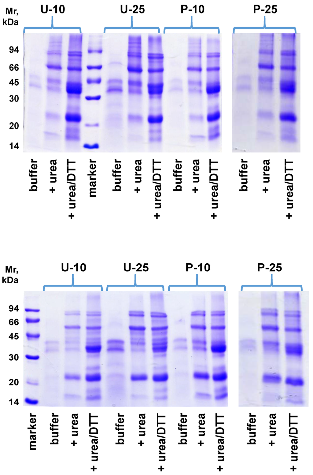 SDS-PAGE profile of proteins solubilized from the various samples in different buffer systems. Aliquots of the various samples were suspended under stirring in 0.05 M sodium phosphate, 0.1 M NaCl, pH 7.0, in the presence/absence of 6 M urea and 10 mM DTT, as indicated. Separations were run on protein samples denatured in the absence (top) or in the presence (bottom) of 2-mercaptoethanol. Samples are identified by letters (indicating the use of untreated (U) or parboiled (P) rice) and digits (10, 25) indicating the percent content in soybean flour.