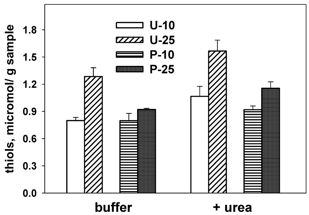 Accessible thiols content of proteins in the various products. Thiols were assessed on finely-ground samples suspended in 0.05 M sodium phosphate, 0.1 M NaCl, pH 7.0, in the presence/absence of 6 M urea as indicated. Different letters for results obtained with each buffer system indicate significant differences (p ≤ 0.05). Samples are identified by letters (indicating the use of untreated (U) or parboiled (P) rice) and digits (10, 25) indicating the percent content in soybean flour.