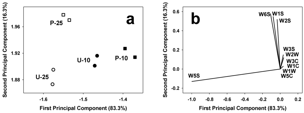 By considering the loading plot (Figure 4b), it is possible to notice that one sensor of broad range sensitivity (W5S) is relevant in the discrimination of samples on the PC1 according to their soybean content. On the PC2, sensors of the WS series (W6S, W1S, and W2S, of broad sensitivity and sensitive to alcohol and methane) were able to discriminate samples on the basis of rice treatment.