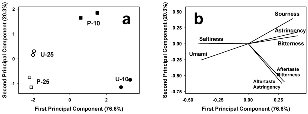 E-tongue PCA score plot (a) and loading plot (b). Samples are identified by letters (indicating the use of untreated (U) or parboiled (P) rice) and digits (10, 25) indicating the percent content in soybean flour.
