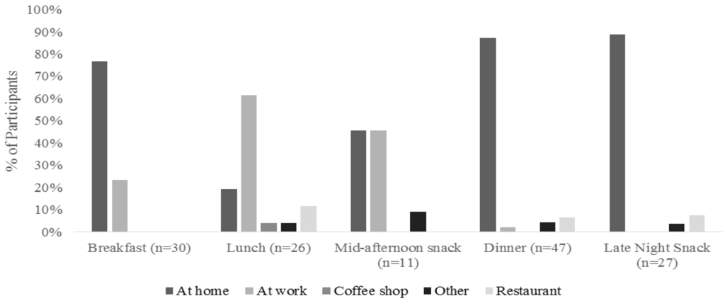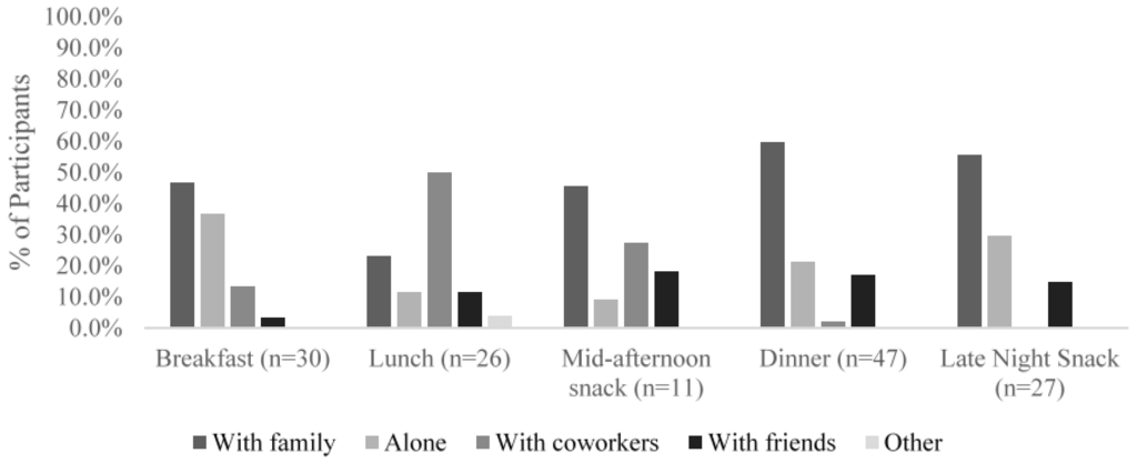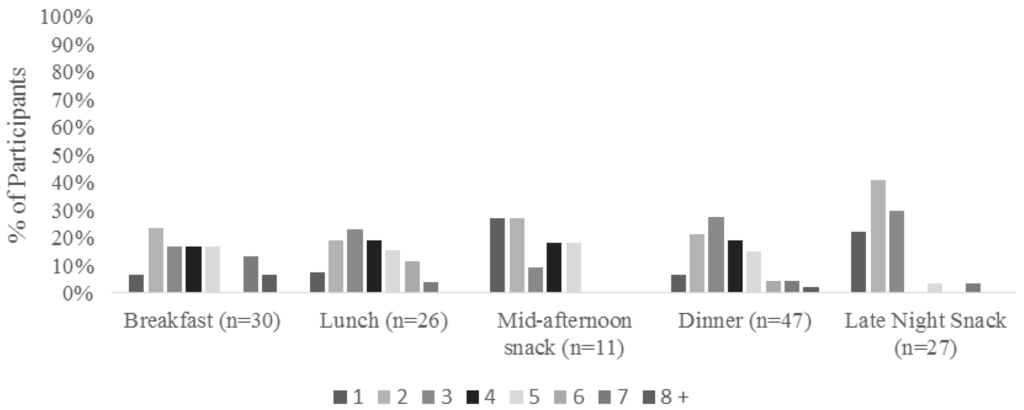 Participants reported the number of food and beverage items that they consumed during their most recent eating occasion. As seen in Figure 2, there was a wide variation in the number of items consumed for each meal, though snacks tended to have fewer items in general. Participants also were asked where they consumed the previous meal, as shown in Figure 3. The vast majority of participants who said that breakfast, dinner, and late night snack was their latest meal consumed that meal at home. Lunch was more commonly eaten at work, while mid-afternoon snacks were eaten either at home or at work. Participants tended to eat breakfast, dinner, and late night snacks either with family or alone, while they typically ate lunch with coworkers (Figure 4). This follows the trend of eating location, where they are more likely to eat with family or alone when they are home, and more likely to eat with coworkers while at work.