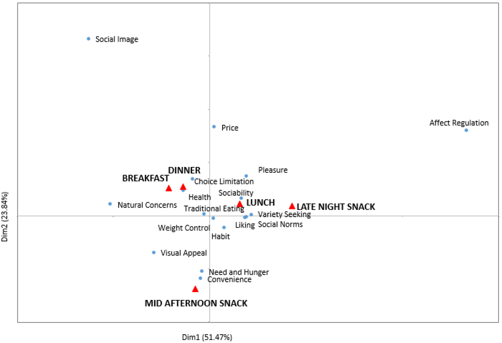The CA factor map (Figure 6) shows motivations for each of the eating occasions from a multivariate perspective. This provided additional information about the motivational constructs of the five eating occasions, besides the statistically significant motivations revealed from the univariate approach above. Food choices for dinner and breakfast were also driven by Choice Limitation (“it is the only option”, “it was what was served”), Traditional Eating (“I grew up with”, “family traditions”), and Health (“to maintain a balanced diet”, “because it is healthy”, “it keeps me in shape”). The drivers for consumption of breakfast were consistent with those found by other authors [26]. Breakfast is the first meal of the day, and for this reason, people try to obtain as much energy as possible from this eating occasion. People look for filling foods that give them the energy to perform the majority of activities of the day. Most of the time breakfast is part of a routine before going to work or school, which do not give enough time for creativity. For this reason, choice limitation which was measured by “it was the only choice”, “it was what was served” was significantly reported by the Turkish respondents in this study. The dominance of dairy at breakfast and vegetables at dinner (Table 2) supported the health motivational construct of these two meals.