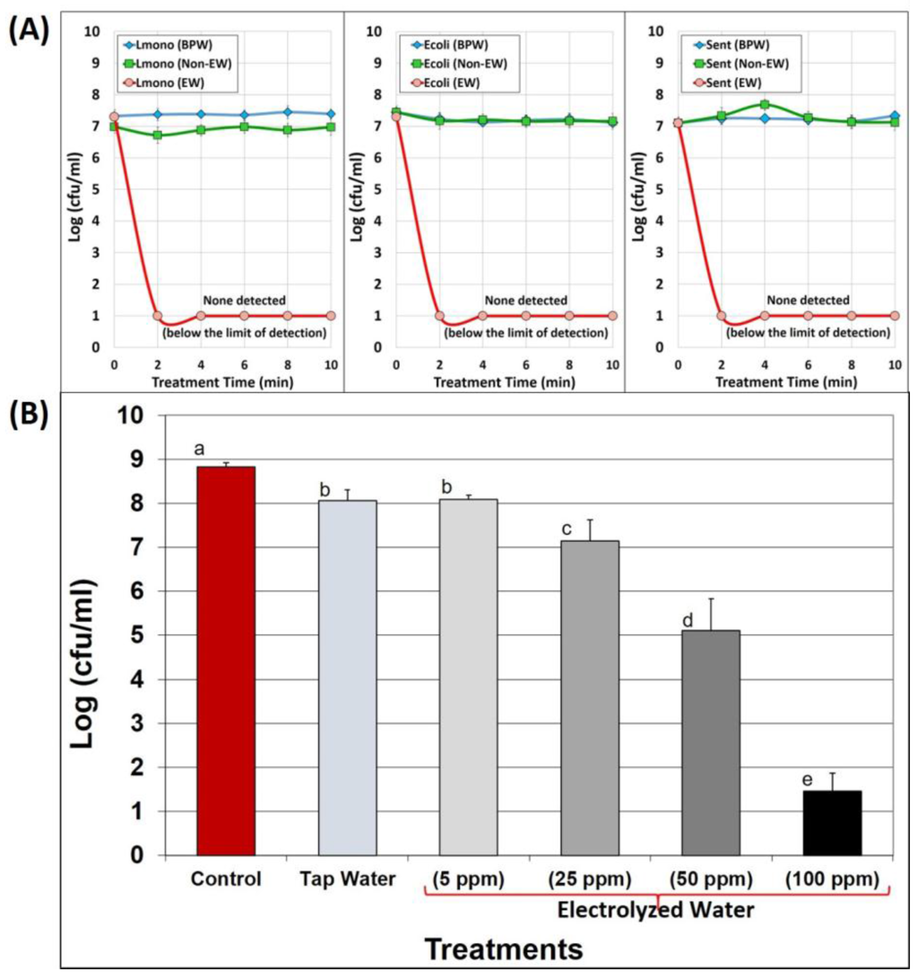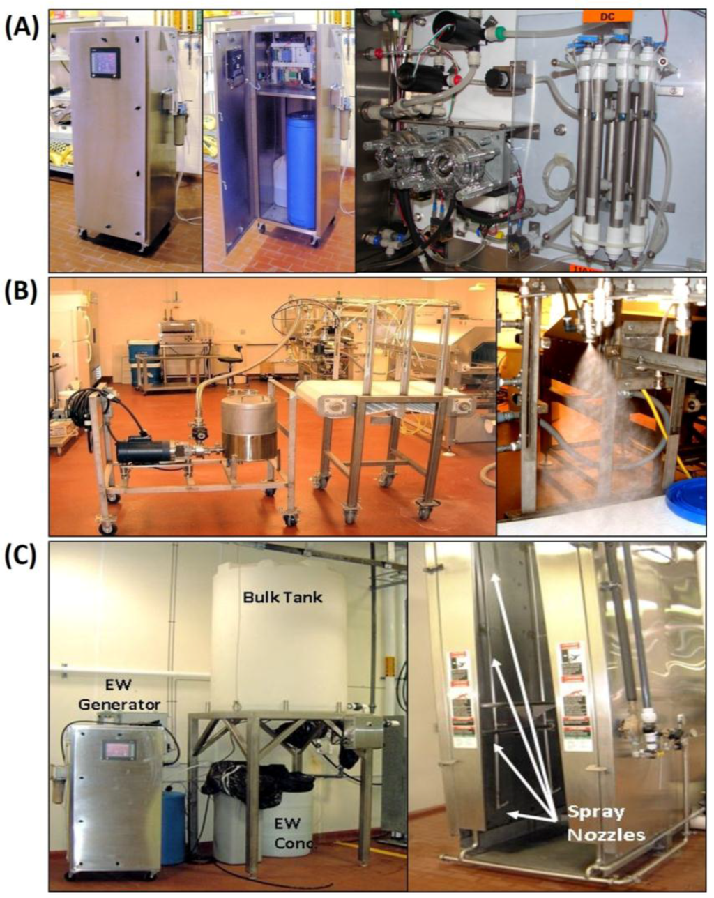 - Venkitanarayanan, K.S.; Ezeike, G.O.; Hung, Y.C.; Doyle, M.P. Efficacy of electrolyzed oxidizing water for inactivating Escherichia coli O157:H7, Salmonella Enteritidis, and Listeria monocytogenes. Appl. Environ. Microbiol. 1999, 65, 4276–4279. [Google Scholar] [PubMed]