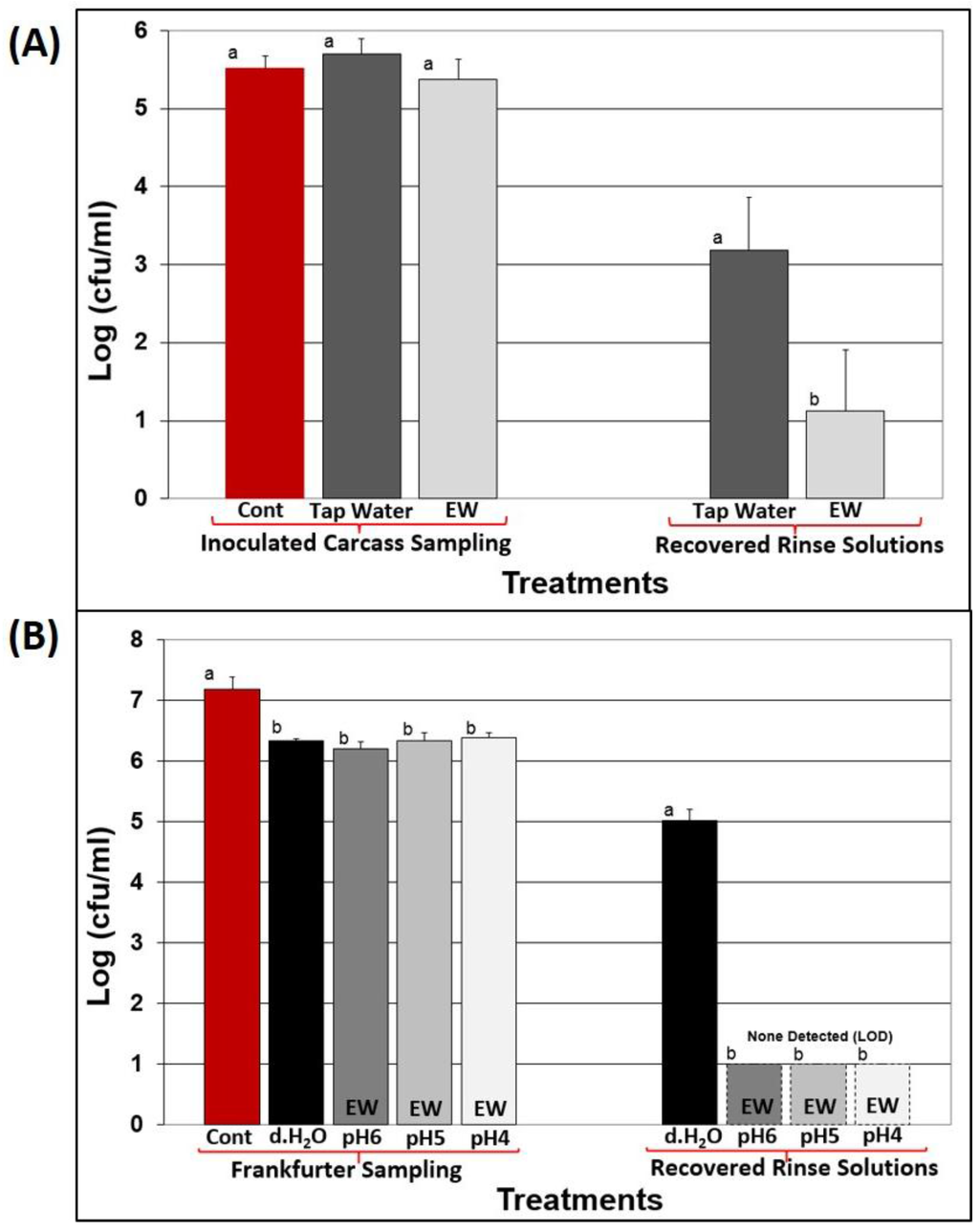 Fabrizio and Cutter [34] also examined the effect of acidic and basic EW on L. monocytogenes-inoculated frankfurters, however, their comparisons were with treatments relative to inoculated but untreated controls. Without comparative water-spray controls, it is difficult to determine the true lethality of treatment, as one may simply be experiencing physical displacement of inoculated organisms by a non-lethal solution (i.e., water) that would otherwise be perceived as microbial reduction due to lethality.
