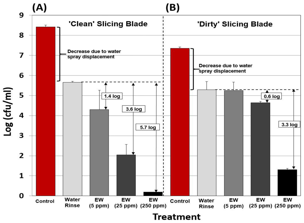 Controls often consisted of inoculated (pretreatment) as well as water spray treatments (non-lethal) in comparison to EW spray treatments (lethal) in order to determine whether reduction of microbial counts was due to liquid displacement from inoculated surfaces rather than lethality from antimicrobial solutions.