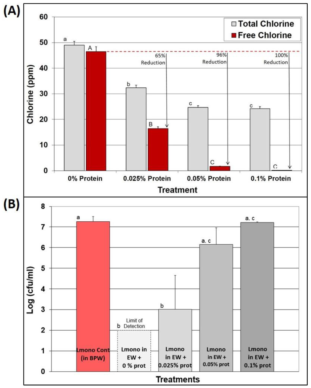 A protein solution assay was used to further examine the effect of organic material on the residual FAC concentration of EW after a brief exposure as well as on antimicrobial efficacy before, and after, the addition of protein. Protein levels as low as 0.025% resulted in a 65% reduction of FAC levels in EW, a 96% reduction in FAC levels at 0.05% protein, and 100% elimination of FAC at 0.1% protein (Figure 5A). When L. monocytogenes was added to these EW/protein solutions, the antimicrobial capability of EW dramatically reduced thereby allowing greater survival of L. monocytogenes, and correlating to the reduction observed with FAC levels (Figure 5B). Even with dissolved protein levels as low as 0.1%, EW efficacy was rendered nil and had little or no effect on reducing L. monocytogenes in solution (Figure 5B). This also explains how 0.1% BPW (i.e., sample dilutions) and/or cell culture suspended in growth media (protein) may reduce the oxidizing capacity of EW that might be added to it.