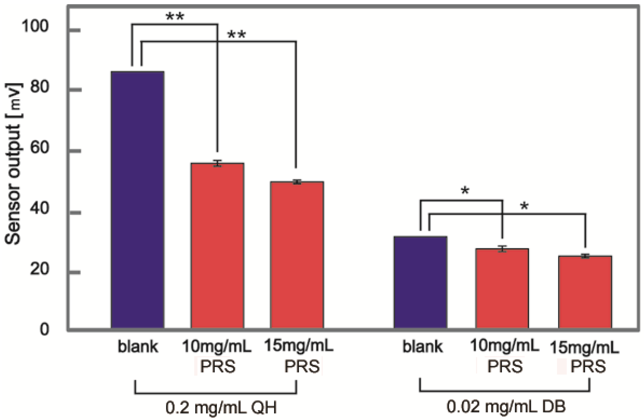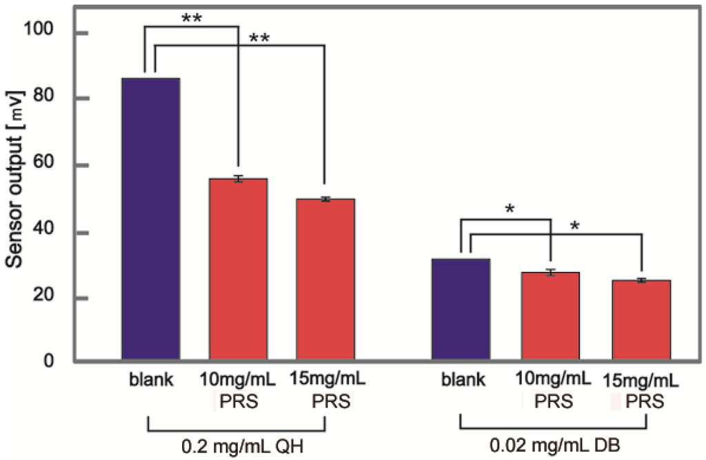 The bitterness of various samples was evaluated using a bitter taste sensor (Figure 1). The sensor output for a 0.2 mg/mL QH solution was 84.9 mV. When 10 and 15 mg/mL of PRS were added to QH, the sensor output for the samples decreased to 54.8 and 48.6 mV, respectively. Similarly, the sensor output of 30.6 mV for a 0.02 mg/mL DB solution decreased to 26.6 and 24.4 mV when 10 and 15 mg/mL PRS, respectively, were added to DB.