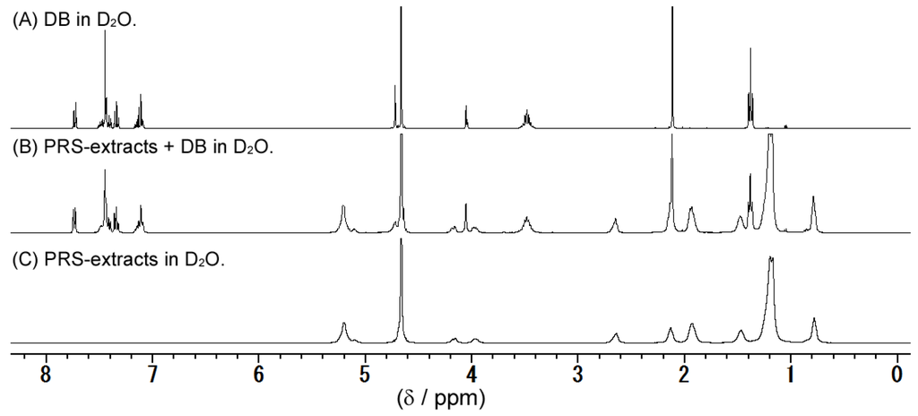 The 1H NMR spectra of DB, the substances extracted from PRS, and a mixture of DB and the extracted substances were measured in aqueous solution, as shown in Figure 3. The DB peaks in the mixture were broadened when compared to those of the DB solution.