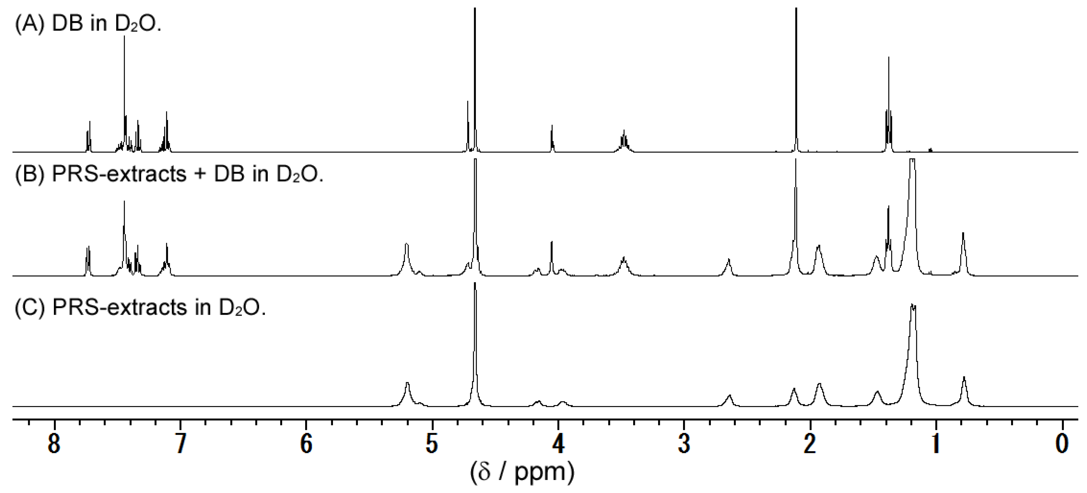 The 1H NMR spectra (400 MHz, 298 K, D2O). (A) DB in D2O solution; (B) PRS extracts + DB in D2O solution; and (C) PRS extracts in D2O solution.