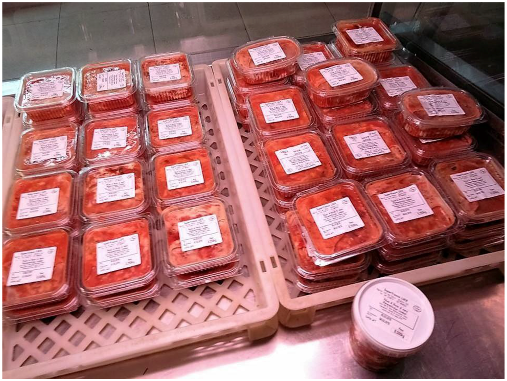 Our study was conducted on sea urchin roe obtained from Paracentrotus lividus populations collected along the coast of Alghero (North-western side of Sardinia, Italy). From January to May 2015. Sea urchin specimens (>50 mm diameter) were hand harvested by professional fishermen in the Gulf of Alghero. Altogether, six different batches of sea urchin were included in our survey. Each batch, consisted approximately of 3000 specimens harvested daily. Live sea urchins were delivered to the local EU dispatch centre of Alghero for processing. The sea urchin shells were cracked open one at a time by hand, using a spade-like tool with sharp triangular blades (Figure 1). The blades break the shell in half, revealing the five undamaged roe. The roe was carefully removed using a tablespoon, cleaned of ingested food and adhering membranes using tweezers, and immediately placed in 500 g plastic containers. Approximately 150–200 specimens were required to obtain 500 g of sea urchin roe. Plastic containers were labelled and stored in a refrigerator room between 0 °C and +4 °C ready to be marketed (Figure 2). The shelf life declared by the producer on the label was five days. Two plastic containers of 500 g of sea urchin roe were randomly collected from each batch included in our survey. The 500 g package is the most widely used in restaurants. All of the items were identified with a univocal code and kept in ice boxes at +3 °C and were transported to the laboratory of the Department of Veterinary Medicine in Sassari and analysed on the same day.