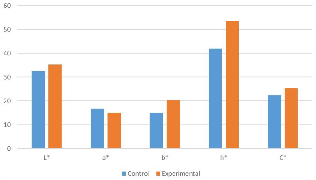Preliminary evaluation of homoscedasticity has been carried out prior to analysis of variance [34]. One-way ANOVA (α = 0.05) using the GLM procedure was performed to test the differences in whiteness (L*), redness (a*), yellowness (b*), hue (h*) and chroma (C*) between “control” and “experimental” samples. Statgraphics plus 5.1 (Statistical Graphics Corp., Rockville, MD, USA) was used for statistical analysis.
