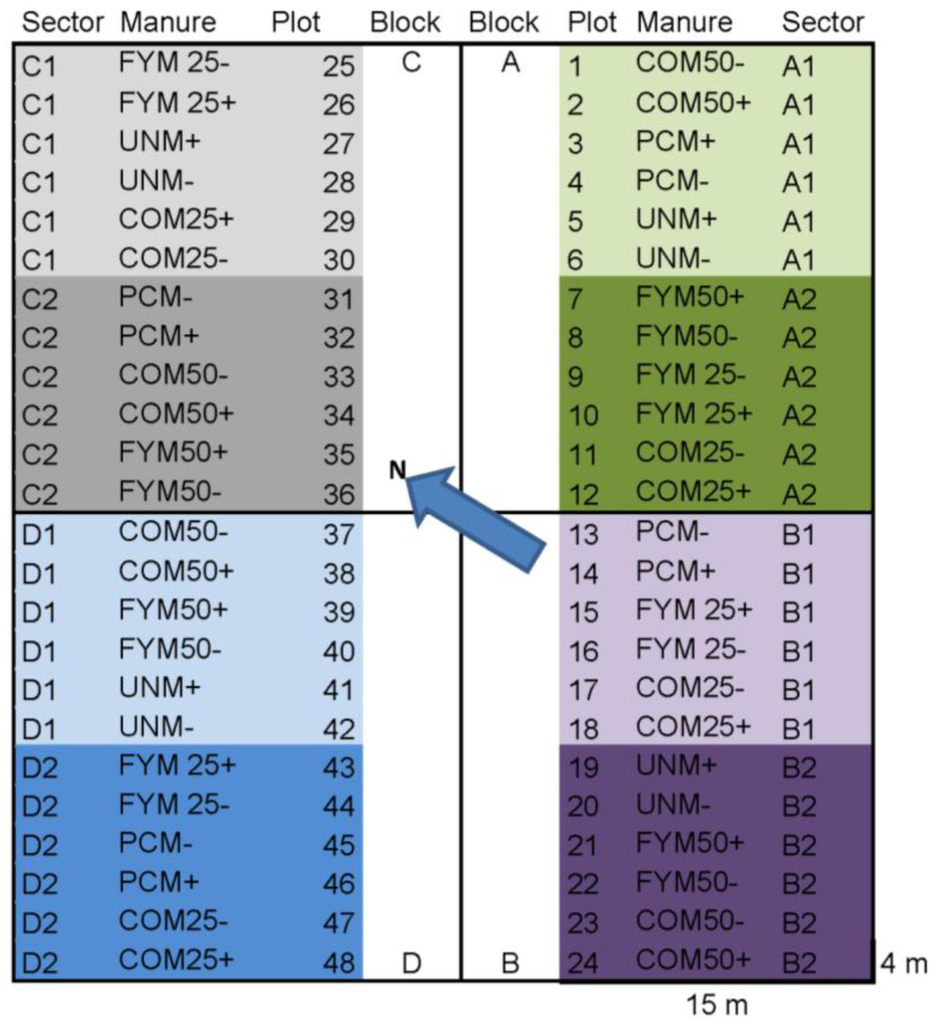 Design of field trial at Skilleby Research Farm 2006, coloured according to sectors used in data analysis. FYM = fresh farmyard manure, COM = composted farmyard manure, PCM = pelleted chicken manure, 25.50 t/ha, +/− = with/without biodynamic preparations.