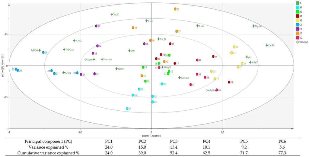 The results showed a strong negative correlation between FaOH/FaTP ratio and the carbon concentration in the soil. The PCA also showed a positive correlation between total carbon and total nitrogen, easily available phosphorus and potassium. This points toward a soil more rich in nutrients. The score for total carbon was also correlated with the scores for the two hexoses along the first principal component. Taken together, it appears that carrots grown in a soil richer in carbon and nutrients were delayed in their development. In order to examine this relationship more closely, however, further experiments with a wider variation in the levels of carbon in the soil are required.