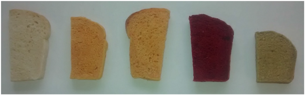 Bread samples showing transverse structure and loaf size. From Left to right: Plain bread, Carrot bread, Tomato bread, Beetroot bread, Broccoli bread.