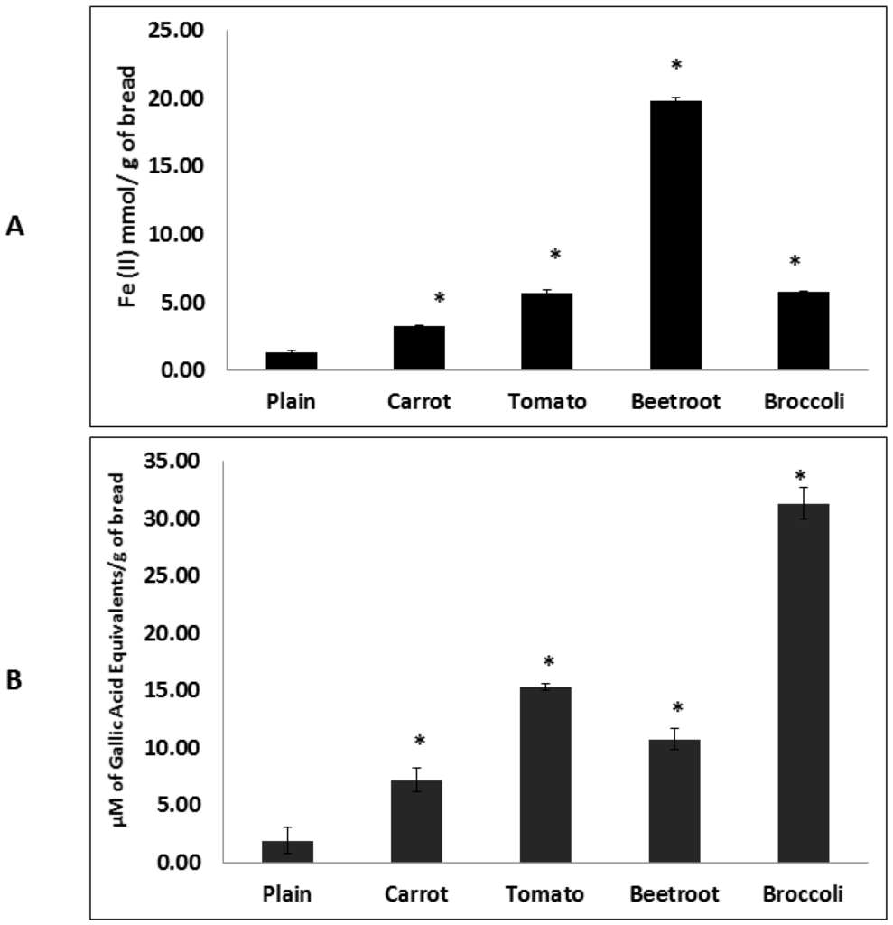 Adding vegetables significantly affected the FRAP assay associated antioxidant capacity of the vegetable breads (F(4,14) = 1793.59; p < 0.001) (Figure 2A). Post hoc analyses showed that all the vegetable breads had significantly higher antioxidant capacities compared to the plain bread. While carrot bread had the lowest antioxidant capacity of all the vegetable breads (3.2 ± 0.2 Fe(II) mmol/g of bread), broccoli and tomato breads demonstrated similar levels (5.8 ± 0.1 and 5.6 ± 0.5 Fe(II) mmol/g of bread, respectively). Beetroot bread had the greatest antioxidant potential and was significantly higher than the others (19.9 ± 0.4 Fe(II) mmol/g of bread).