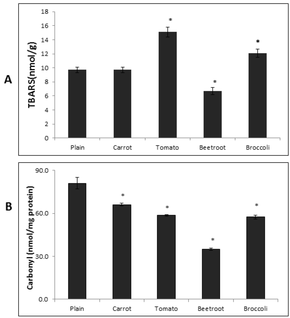 The PC content in the fresh breads also differed significantly (F(4,10) = 217.71; p < 0.001) (Figure 3B). The plain bread contained the highest PC content and was significantly higher than all the vegetable breads (81.1 ± 4 nmol/mg protein). The beetroot bread had the (significantly) lowest PC content (34.9 ± 1 nmol/mg protein) followed by tomato and broccoli breads which had comparable amounts (58.6 ± 1 and 57.4 ± 1 nmol/mg protein, respectively) that were significantly different to all other breads. The carrot bread contained the second highest PC content and was significantly different to all the other breads (66.1 ± 1 nmol/mg protein). Correlational analysis showed that there was no association between TBARS and PC contents in the breads (r = 0.30, p = 0.62).