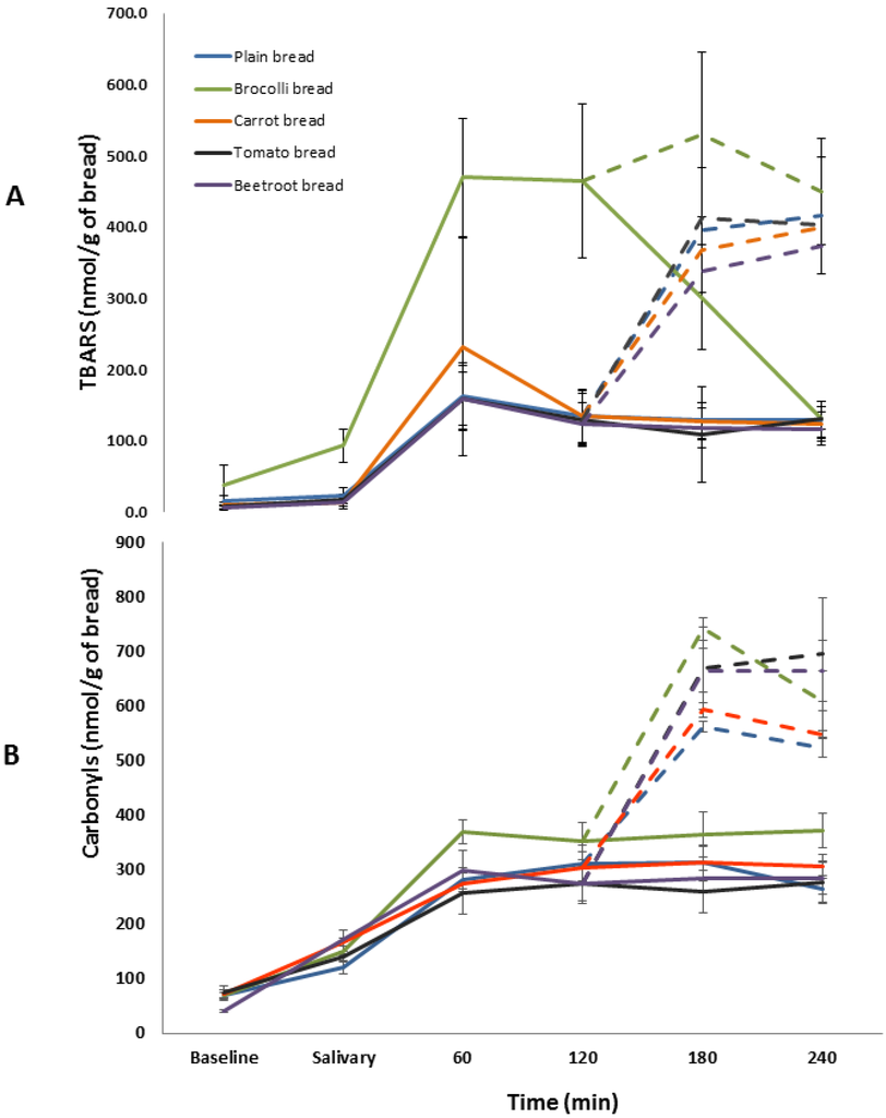 Temporal changes in TBARS (A) and protein carbonyls (B) production during gastro-intestinal digestion of the breads. Solid lines represent the salivary and gastric phases of digestion. The broken lines represent the intestinal phase of digestion. Values are means ± SE (n = 6).