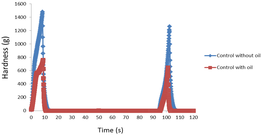 Representative graphical representation of the effect of oil on the firmness of bread crumb after four days of storage.