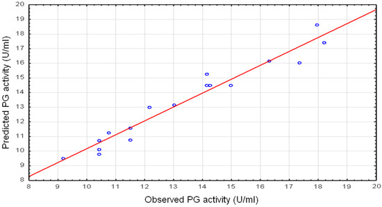 where Y is the response for the PG activity and X1, X2 and X3 represent the variables pH, lactose and CaCl2, respectively. Furthermore, a correlation was drawn between experimental data and the predicted values by the model as given in Figure 1.