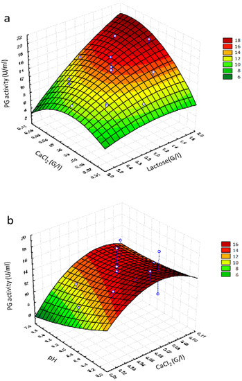 No significant interactions were observed between pH and CaCl2 (Table 7). Low PG values were obtained at about pH 6.2 (Figure 2b), in agreement with the results reported by Suresh et al. [51], who studied the stability of PG synthesized by Aspergillus awamori in submerged fermentation as a function of pH, and observed that the enzyme was quickly denatured when pH was raised at values higher than 5.4. Therefore, the maximum of potentiation of PG activity was obtained only at low levels of pH (5.2) and low levels of calcium chloride (approximately 0.09 g/L).
