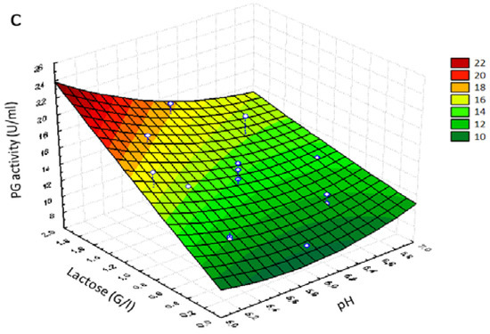 Lactose at higher concentrations and pH at higher values depleted the potentiation of PG activity, while a better combination was higher lactose concentration and lower pH values, which showed a positive effect on potentiation of PG activity (Figure 2c), thus highlighting that these variables act in the opposite manner on the potentiation of PG activity. According to the response surface point prediction analysis, pH 5.16, lactose concentration of 1.84 g/L and CaCl2 (0.089 g/L) maximized the yield of PG up to 21.83 U/mL.