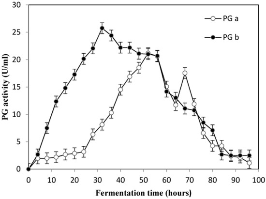 The addition of lactose to tomato basal medium significantly (p ≤ 0.008) increased the potentiation of PG activity of 57.39%, thus suggesting that the amount of pectin in tomato pomace and the lactose addition are enough to obtain high levels of PG. Pectin used as the sole source of carbon for PG production initially induced PG activity, and when the medium was supplemented with lactose the production was enhanced. The positive combined effect of pectin with other carbon sources herein observed is in agreement with other studies, for example Mukesh et al. [54], who reported also that the use of cassava waste as substrate in combination with lactose supported maximum pectinase production by Bacillus sp. MFW7.