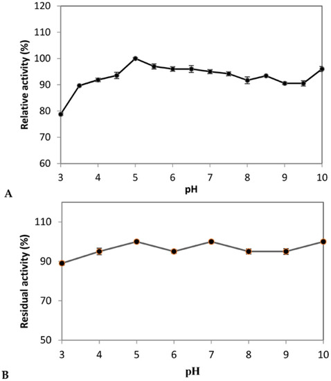 The stability of enzyme against various pH is important for its commercialization and was also tested. It was observed that the enzyme is stable over a broad range of pH values and retained its 100% activity at pH 5.0, 7.0 and 10.0 up to 180 min (Figure 4B). Similarly, PG from Klebsiella sp.Y1 was reported to be stable in a wide range of pH (2–12) in digestive tract of sheep [68]. However, Manachini et al. [69] reported the stability of PG from A. pullulans at pH 4.0 to 6.5.