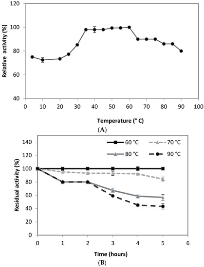 Temperature is also significant for the activity and stability of any enzyme. The stability of an enzyme against different temperatures represents the capability of an enzyme to resist against thermal denaturation in the absence of substrate and it is one of the major requirements for the commercialization of the enzyme in industries. It was observed that the PG was active over the broad range of temperature range 4–90 °C with optimum temperature of 60 °C (Figure 5A), slightly higher than that reported from Aureobasidium pulluans LV10 [69]. When maintained at 60 °C for 1 h, the retained activity of PG was 100%. At 70 °C for 5 h, 85% of original PG activity was retained. A residual activity of 56% was noted even after 5 h of incubation at 80 °C (Figure 5B). A high residual activity of 45% and 43% at 90 °C after 4 and 5 h of incubation, respectively, indicated the potentiality of the thermostable enzyme. The PG reported in this research seems to be different from formerly reported enzymes in terms of adaptability for temperature and pH.