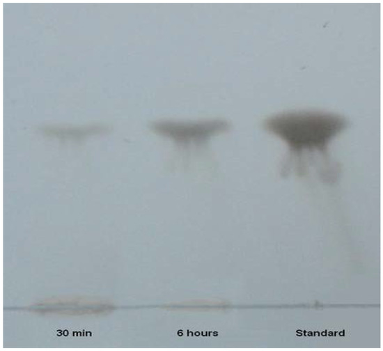 Thin layer chromatography of hydrolysis products of PG from polygalacturonic acid after a reaction period of 30 min and 6 h, revealed the presence of one spot which corresponded to the standard monogalacturonic acid (Figure 6). PG appeared to be an exo-polygalacturonase acting at the end of the polygalacturonic chain.