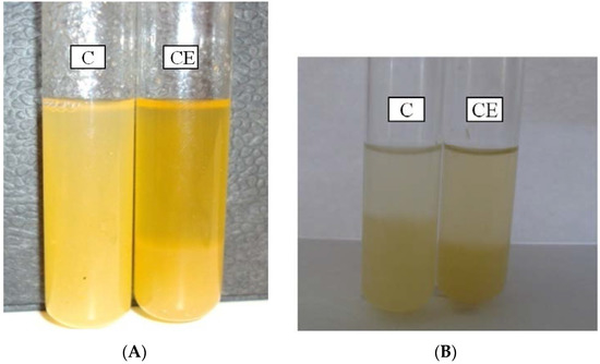 The capacity of exo-PG to degrade insoluble pectin molecules into soluble galacturonic acid was tested on a freshly extracted apple and citrus juice. Five mL of juice were incubated with crude enzymes (CE) for 4 h at 30 °C. The treated and non-treated samples were then left to decant for 48 h at 4 °C and photographed (Figure 7A,B). A clear net difference was observed between the treated and control tube. The analysis of the clarified juice showed a noticeable increase in terms of supernatant, at 30% (= (4 mL − 2.5 mL)/5 mL) and 60% (= (4 mL − 1mL)/5 mL), using CE to clarify citrus and apple juice, respectively, as compared to the non-treated sample, considered as control (Table 8A,B). The crude enzyme provided 30% and 60% of clarification of citrus and apple juices. Table 8A,B also shows that the amount of reducing sugars released after enzyme treatment in the apple and citrus juice was highly increased while the dry weight and A420 decreased.
