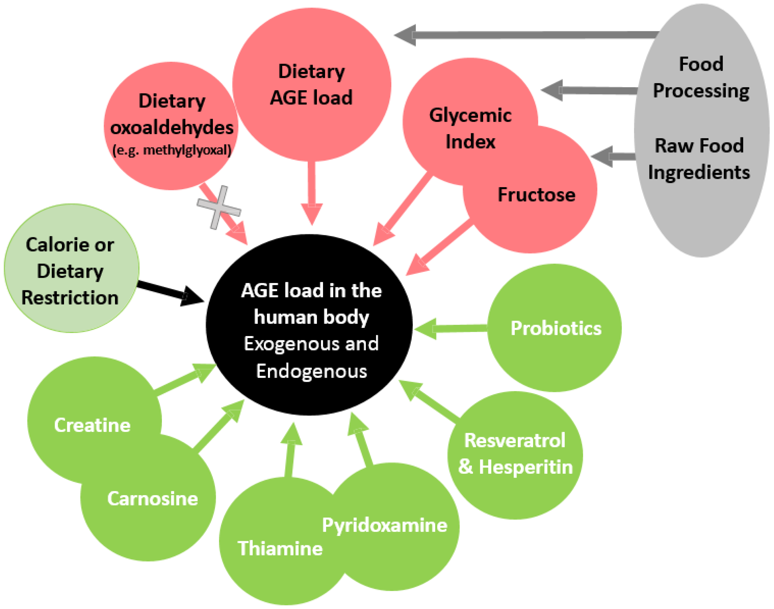 Figure 1 shows that several constituents of foods can affect the in vivo AGE load. First of all, an overall caloric restriction was found to affect the accumulation by different amounts, some greater, some smaller, of both early and advanced glycation products. The reduction of the exposure to dietary AGEs and the reactive precursors was also found to limit the accumulation or the formation of AGEs in vivo. As a result of this, food scientists and technologists have long been exploring how potentially deleterious AGEs and other Maillard reaction products (MRPs) could be mitigated in processed foods. A more adapted heat treatment during food processing and a better selection of the raw food ingredients are known to be the two main courses of action for limiting the exposure to dietary AGEs. Special attention was given in particular to the selection of raw foods because of the influence of their carbohydrate composition on the in vivo AGE load (e.g., the amount of fructose or the proportion of complex carbohydrates in food).