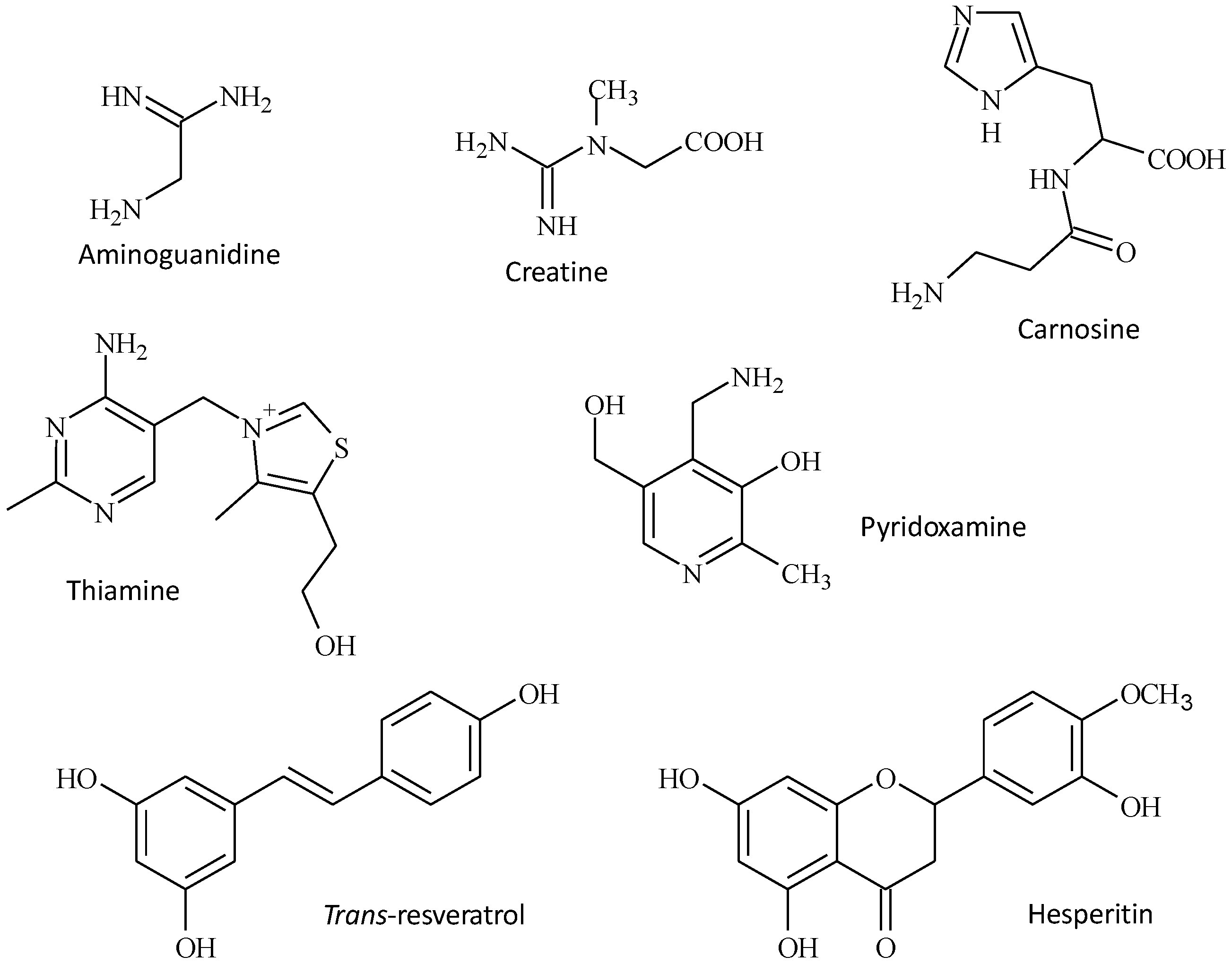 Some naturally-occurring compounds or their derivatives have also been tested for their potential effects against the formation of AGEs in vivo. Like AG, some of them are thought to compete with amino groups on proteins. In other words, by “sacrificing” themselves for others, they have the potential to preserve the chemical integrity of the proteins in vivo and, thus, limit the accumulation of AGEs in tissues.