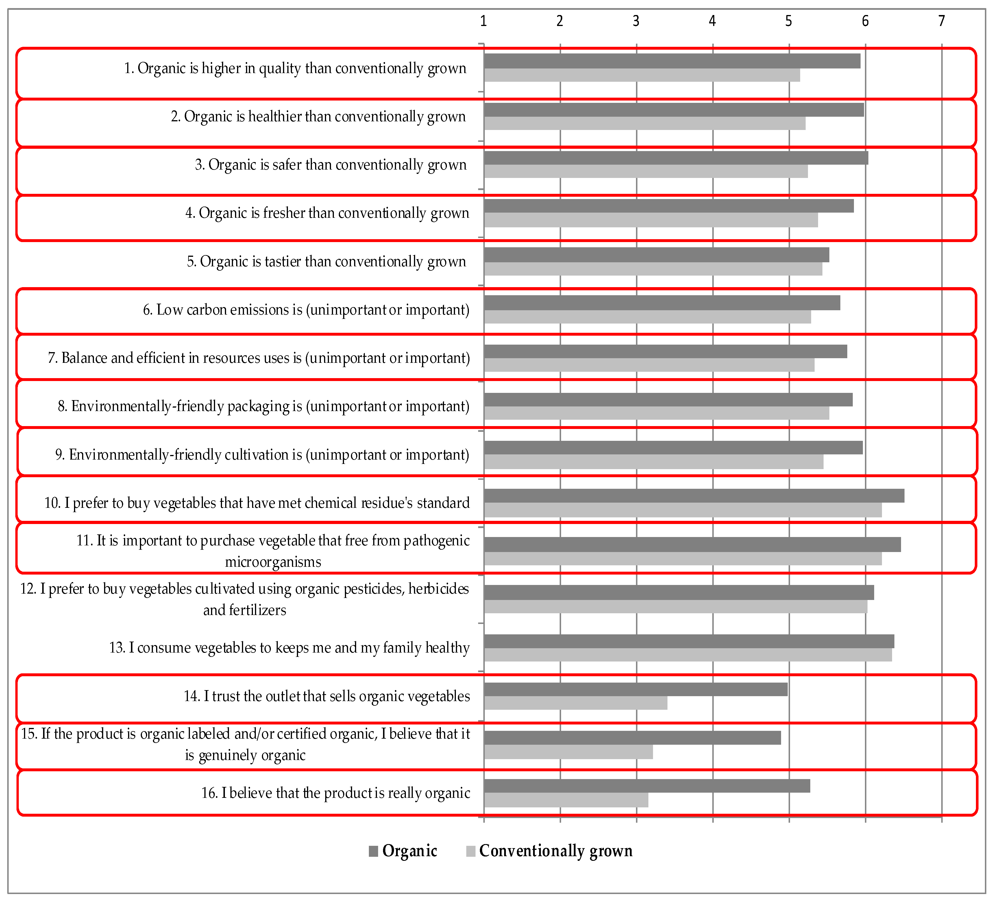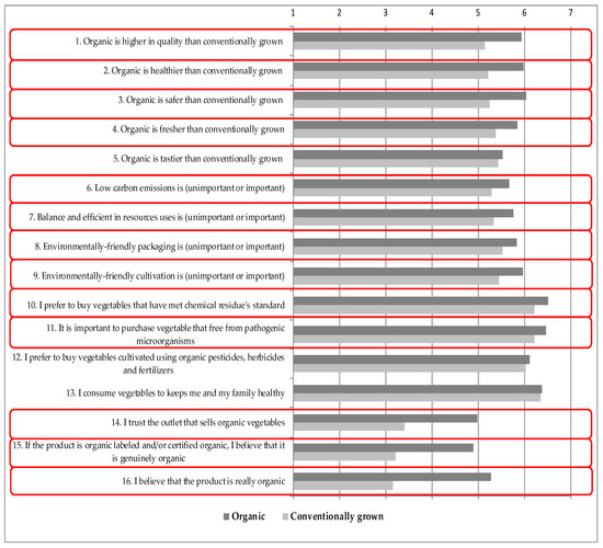 There were questions based on a 7-point Likert scale with which respondents conveyed their opinions regarding factors driving their vegetable purchasing behavior. The differences in the statement evaluation between both consumer groups are presented in Figure 1. The highest mean value was found for the items on safety and health (statements 2, 3, 10, 11, 12, 13, and 14). This value indicates that both respondent groups believe that organic foods are indeed better for consumers’ health, compared to conventionally grown products. Moreover, they perceived safety and health to be more important aspects of vegetable purchasing. The lowest mean value was obtained for items related to the trust aspects (statements 14, 15 and 16), which asked how consumers perceived their beliefs toward organic stores, organic labels/certificates, and the originality of organic products. Organic consumers seem to have a higher degree of agreement with all the statements compared to conventionally grown consumers. Therefore, a differences analysis (based on t-test analysis, p-value < 0.05) was carried out in order to investigate possible significant mean differences between the groups. Significant differences between organic and conventionally grown consumers were found in 13 out of 16 statements, except statements 5, 12, and 13, where both sets of consumer answers tended to be similar.