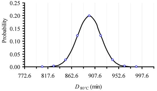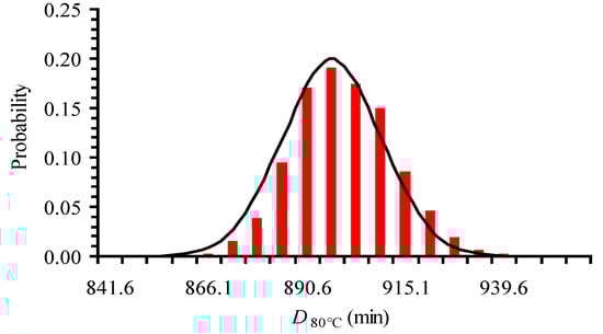 In applying the Monte Carlo simulation, a normal distribution was assumed to describe DT variability. A similar approach was used by [] when assessing the confidence intervals of Ea and kref parameters of the Arrhenius equation for non-isothermal degradation of cyanidins. An example of such a normal distribution, which is constructed based on the estimate of the mean value, μ, of 896.3 min and its standard deviation, (σ = 22.5 min) is demonstrated in Figure 1; it refers to the D80 °C value and it is based on the relative experimental data. The distribution was discretized every 0.5 × σ intervals on the DT scale, the central interval being located between μ − 0.25 × σ and μ + 0.25 × σ. Within each such interval, a single DT value, equal to the DT value at the middle of the particular interval, was assigned (Figure 1). The same procedure was followed to construct the corresponding distribution curves for all eight temperatures of the isothermal experiments.