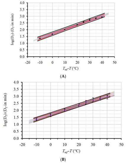 Using the error propagation laws, generally described by Equation (3) [,] and in order to calculate the 95% Confidence Intervals (CI) of the parameters DT, DTref and z (described as δ(DT), δ(DTref), δ(z), respectively) from the corresponding 95% CI of 1/DT, 1/z, and log(DTref) (described as δ(1/DT), δ(log(DTref)), δ(1/z), respectively) appearing in Equations (1) and (2), Equations (4)–(6) were used: