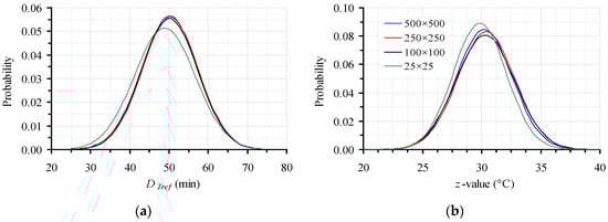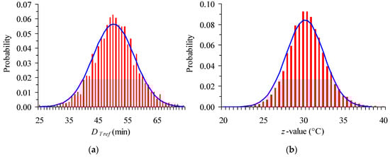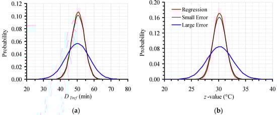 The distributions in Figure 4a,b were constructed based on mean values and their 95% CI of parameters D120 °C and z respectively, which were calculated to be 50.2 ± 13.9 min and 30.2 ± 4.6 °C, for the expanded error, compared to 50.6 ± 7.7 min and 30.2 ± 2.4 °C for the small, original error.