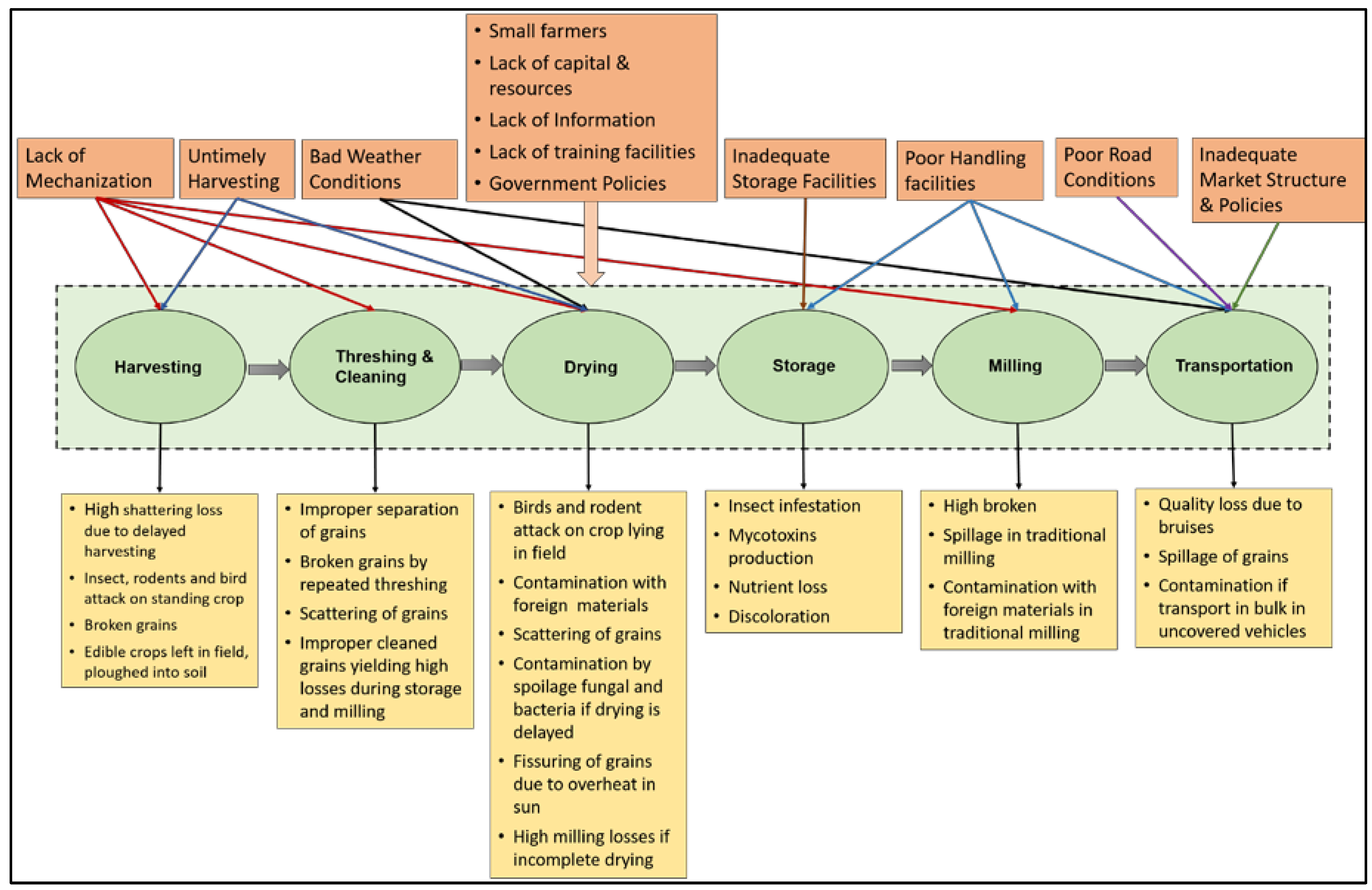 Figure 1 summarizes various losses that occur during the supply chain of cereal crops and major factors responsible for those losses in the developing countries.