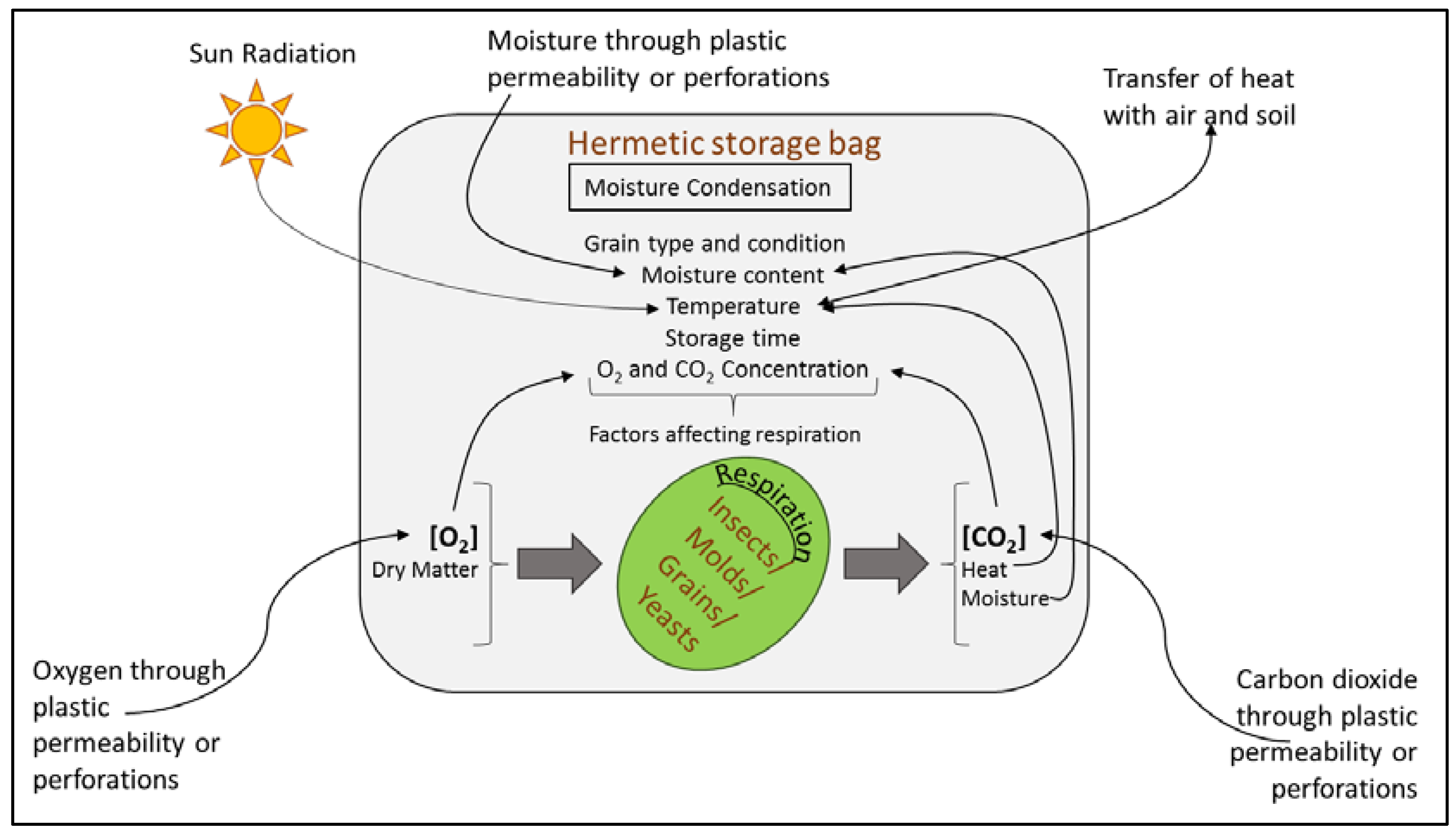 The relationship of the main factors affecting the respiration of grain and microorganisms in hermetic storage has been described in the Figure 3 [72]. The CO2 concentration inside the bags is usually used as an indicator of the biological activity of grains. [72,73]. Permeability of the bag and the gas partial pressure effect the movement of gases (O2 and CO2) in and out, whereas the concentration of these gases inside the bag depends on the balance between these exchanges and the respiration of the biotic portion of grains. Higher initial moisture content tends to increase the CO2 concentration because of the increased respiration, however, the change was not found to be significant [72].